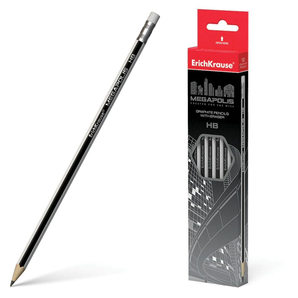 Описание Карандаш чернографитный ERICH KRAUSE, 1 шт., «Megapolis», HB, с ластиком, корпус серебристый, заточенный, 32860Чернографитный карандаш ERICH KRAUSE «Megapolis» легко затачивается.