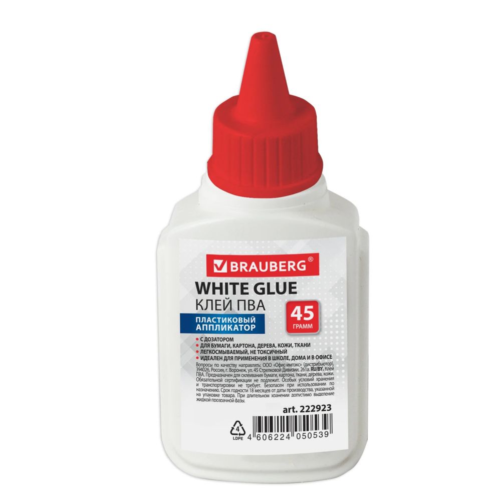 Описание Клей ПВА BRAUBERG (бумага, картон, дерево), 45 г, 222923Клей ПВА BRAUBERG предназначен для склеивания бумаги, картона, фотографий, дерева.