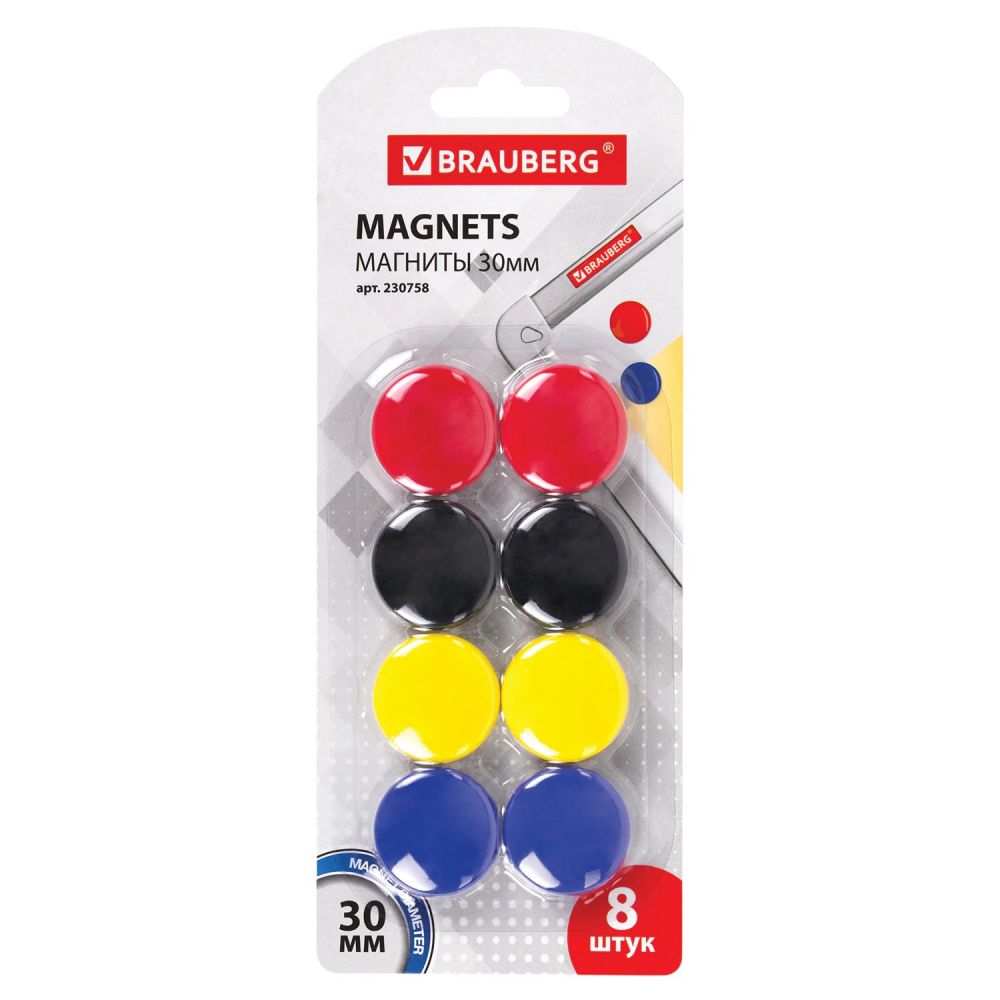 Описание Магниты диаметром 30 мм, КОМПЛЕКТ 8 штук, цвет АССОРТИ, в блистере, BRAUBERG, 230758Магниты BRAUBERG круглой формы с пластиковым покрытием для магнитно-маркерных досок.
