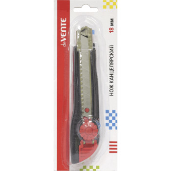 Описание Нож канцелярский "deVENTE" 18 мм, металлические направляющие, ручная блокировка лезвия, картонный блистер, черный с красным